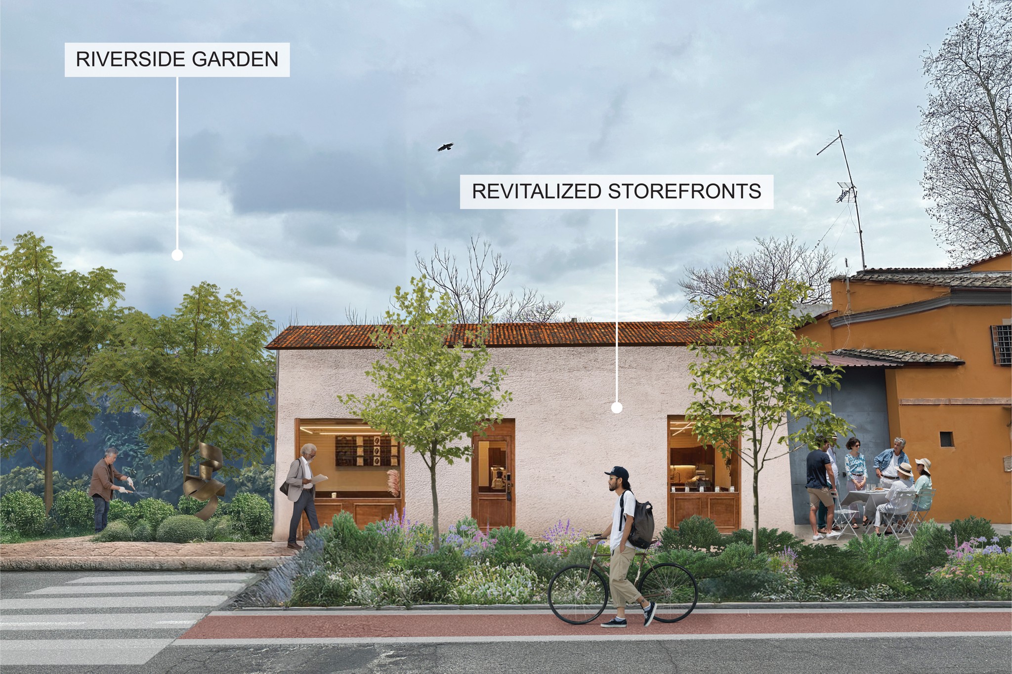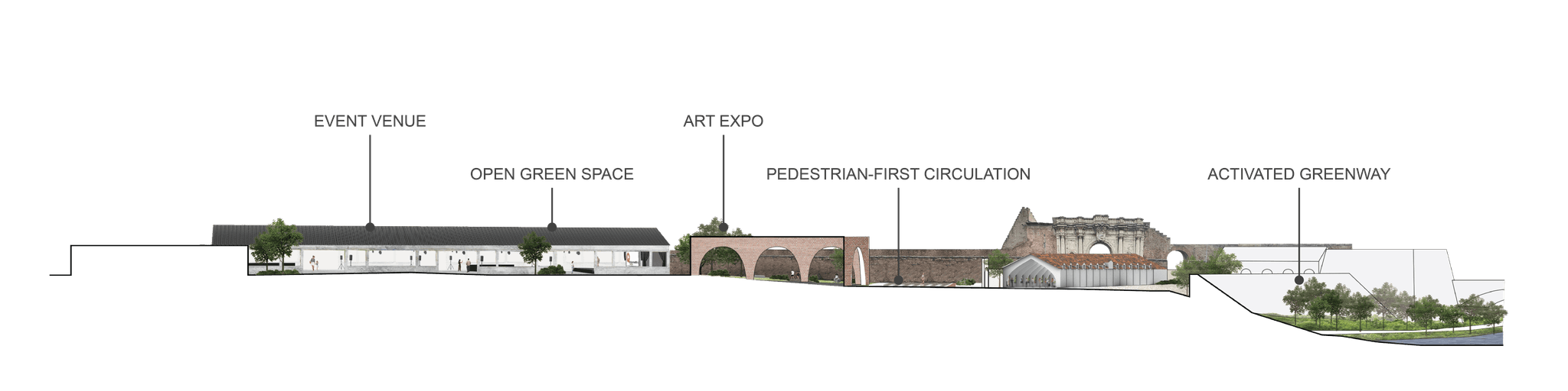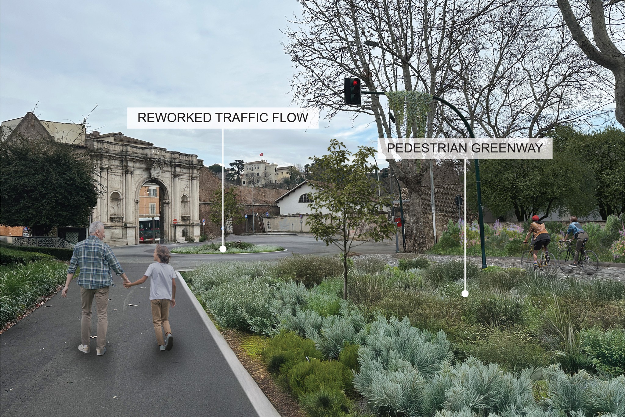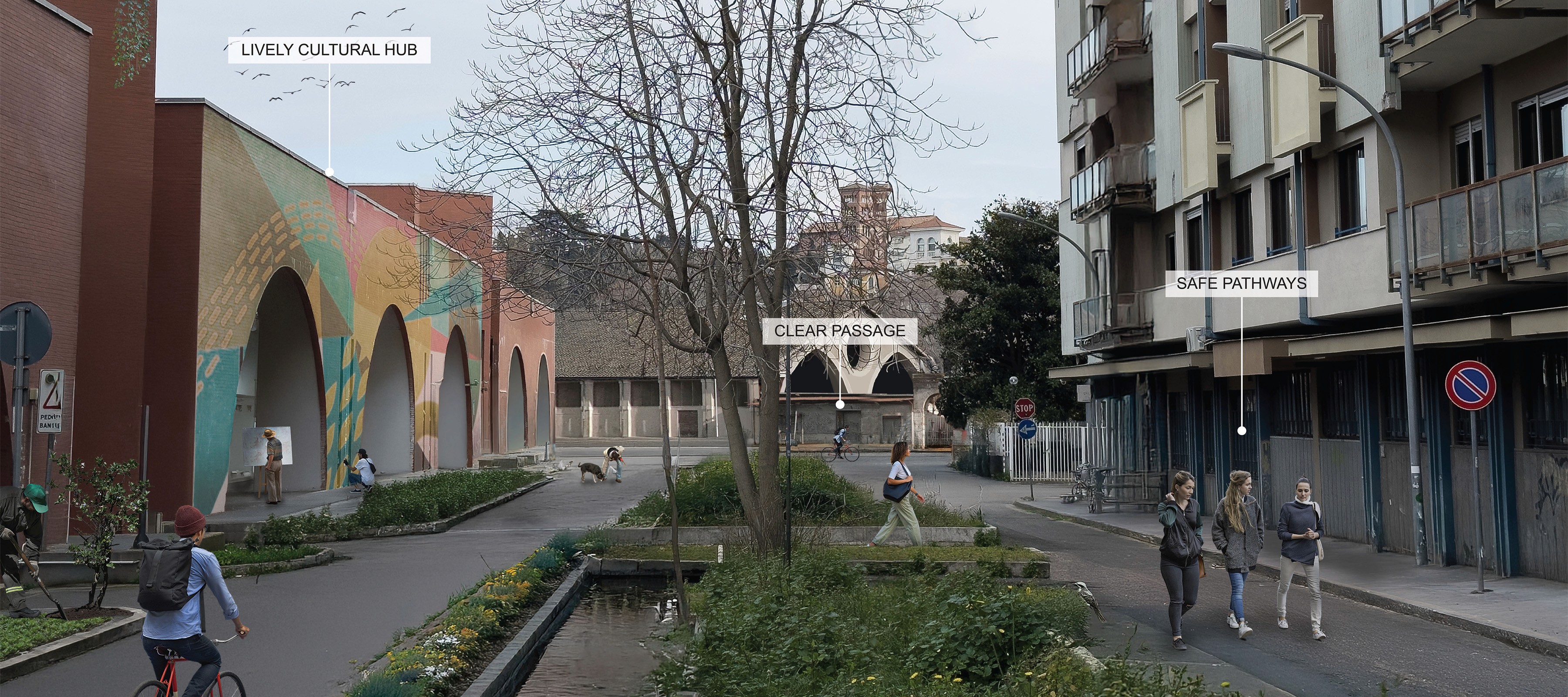 Civic Synergy promotes a vibrant cultural hub that will increase the reach of the arts through creative partnership. Revitalized existing buildings along the Tiber riverfront and lining the ancient city wall will host exhibition spaces, flexible workshops, and culinary markets to strengthen community engagement. Pedestrian focused streetscapes, including slow zones and car free pathways, enhance walkability, promoting a healthier lifestyle and sustainable transportation. Civic Synergy transforms the area’s diverse functions to harness and integrate activities into a harmonious, interconnected urban framework.