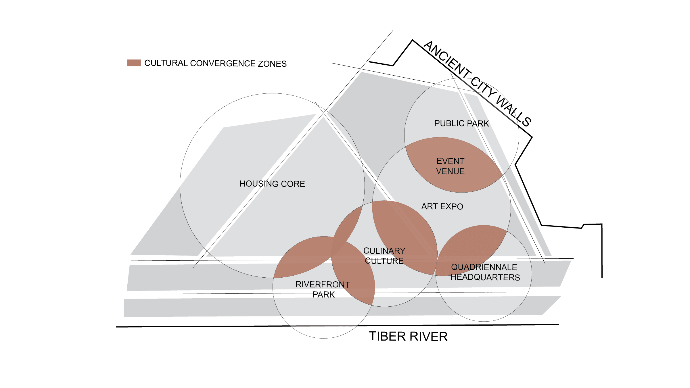 Civic Synergy promotes a vibrant cultural hub that will increase the reach of the arts through creative partnership. Revitalized existing buildings along the Tiber riverfront and lining the ancient city wall will host exhibition spaces, flexible workshops, and culinary markets to strengthen community engagement. Pedestrian focused streetscapes, including slow zones and car free pathways, enhance walkability, promoting a healthier lifestyle and sustainable transportation. Civic Synergy integrates the area’s diverse functions and activities into a harmonious and interconnected urban framework.