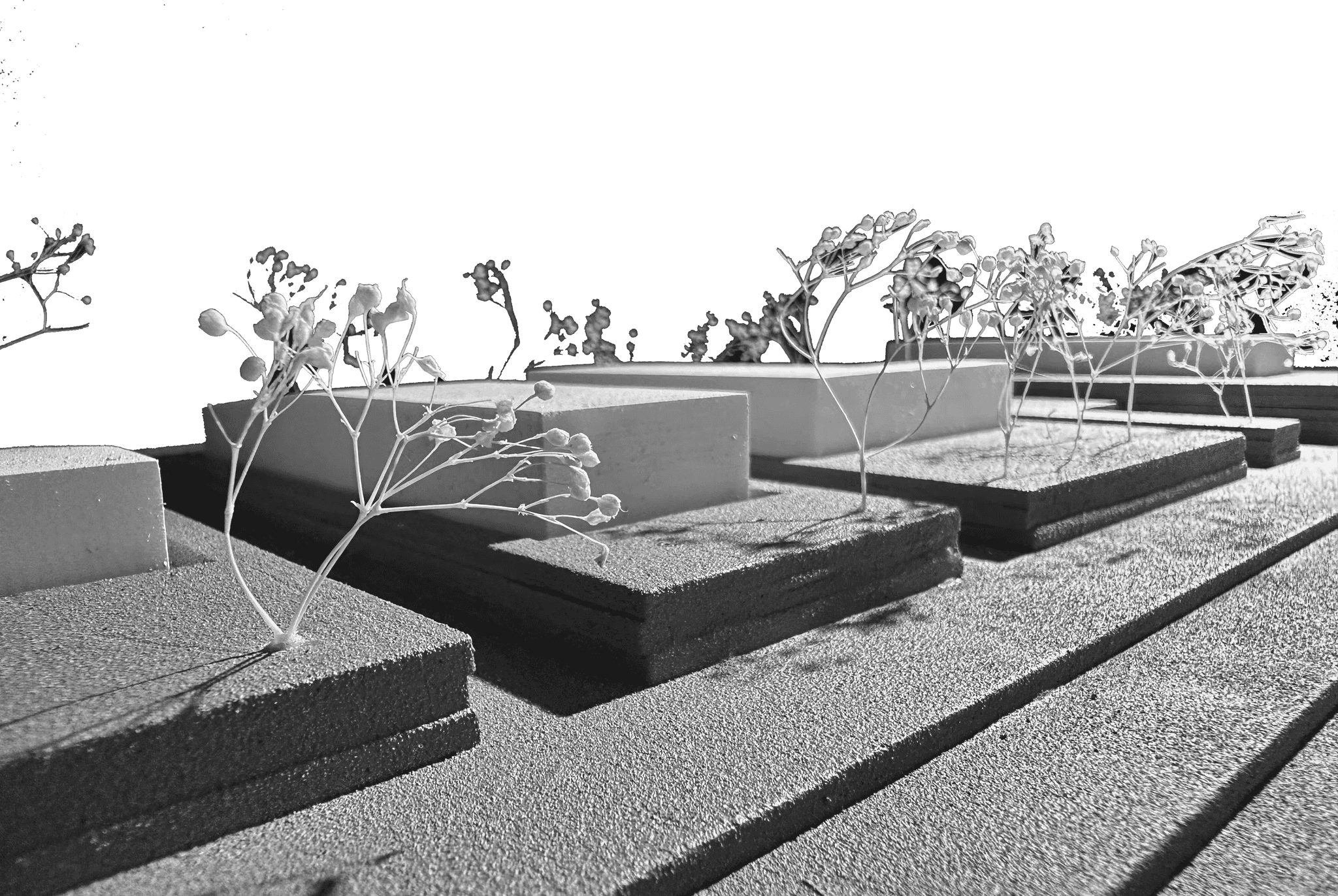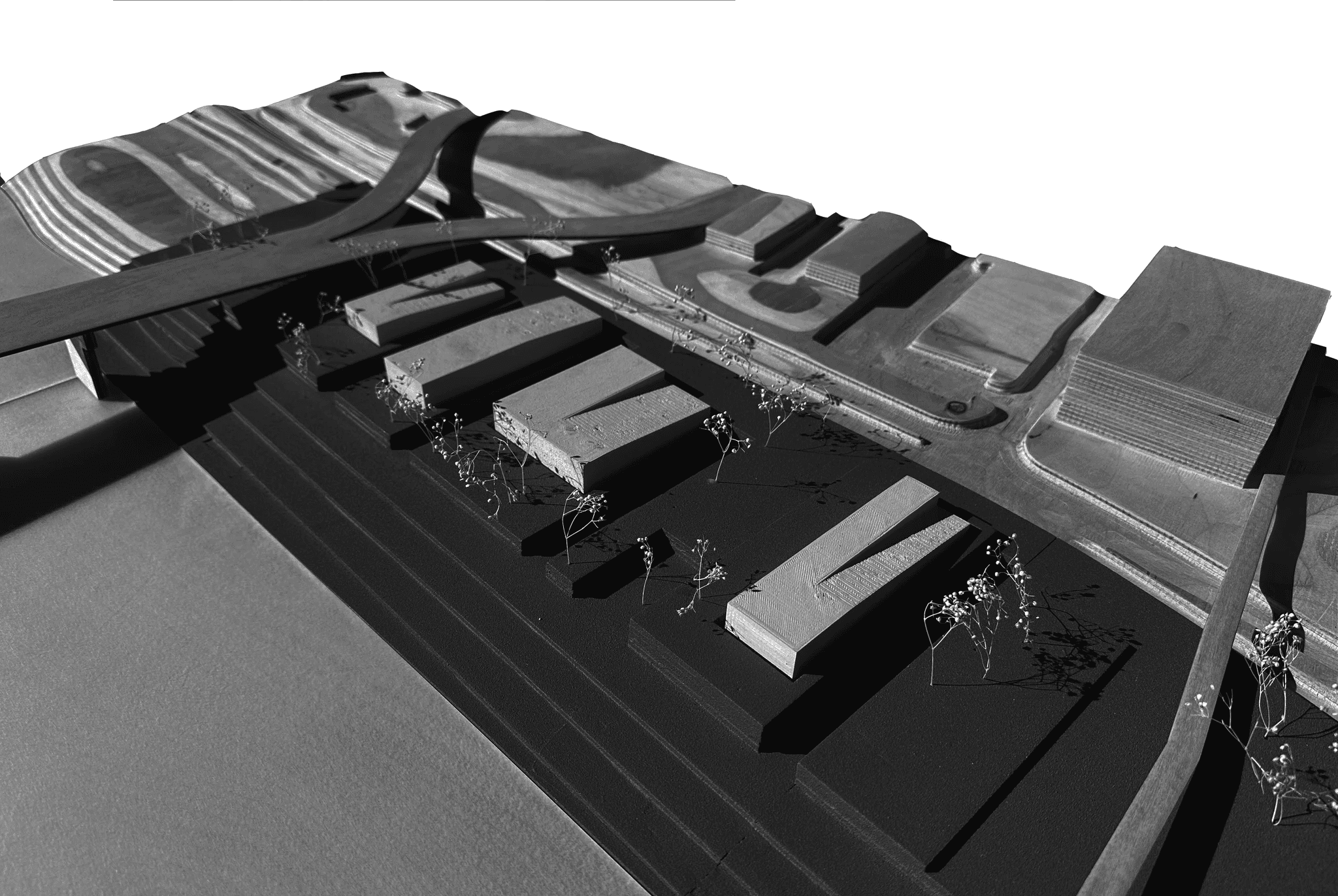 A linear axial path unites the campus, functioning as both circulation and narrative. Along this path, the buildings align with programmatic identities, establishing the campus as a sequential journey toward holistic health. Water retention zones separate and define each structure, acting simultaneously as flood mitigation infrastructure and ecological systems that sustain vegetation and microclimates throughout the site.