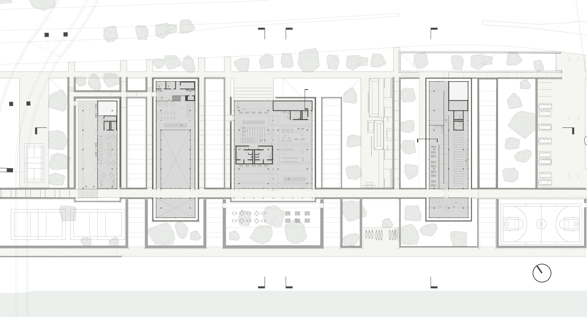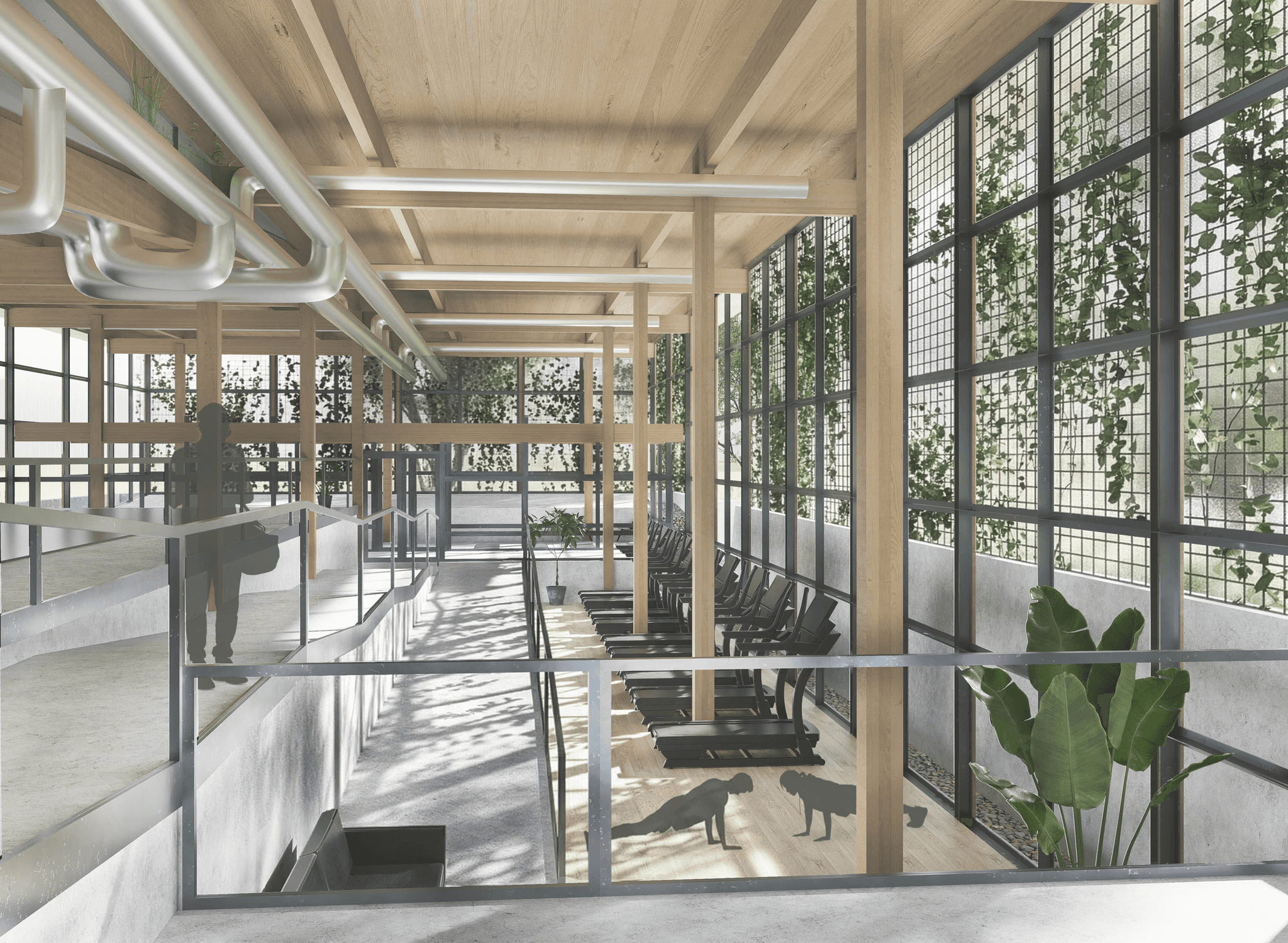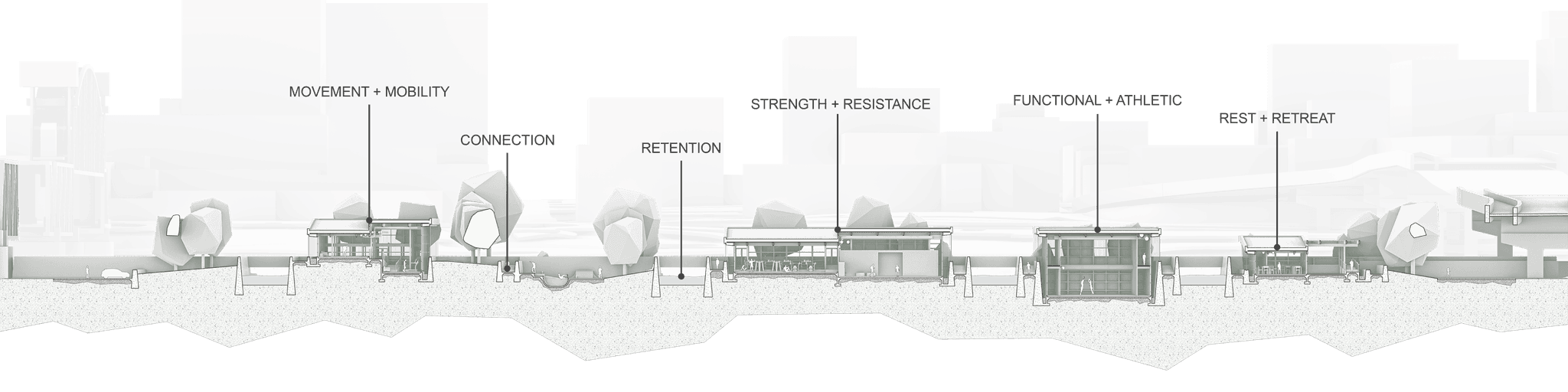 The campus is organized around a defined gradient of activity that moves from movement + mobility, strength + resistance, functional + athletic, and finally rest + retreat. This gradient establishes the spatial and experiential logic of the site, while flexibility occurs within each building’s interior organization that simply caters to these occupations. Wellness is framed not as a singular destination, but as a progression shaped by movement through space.