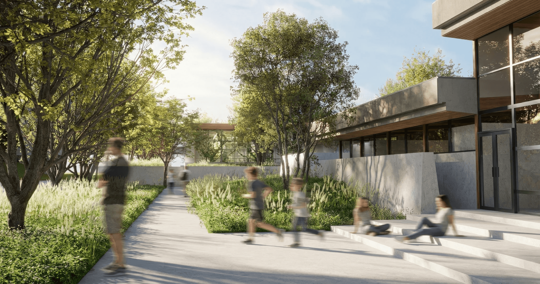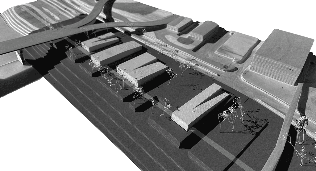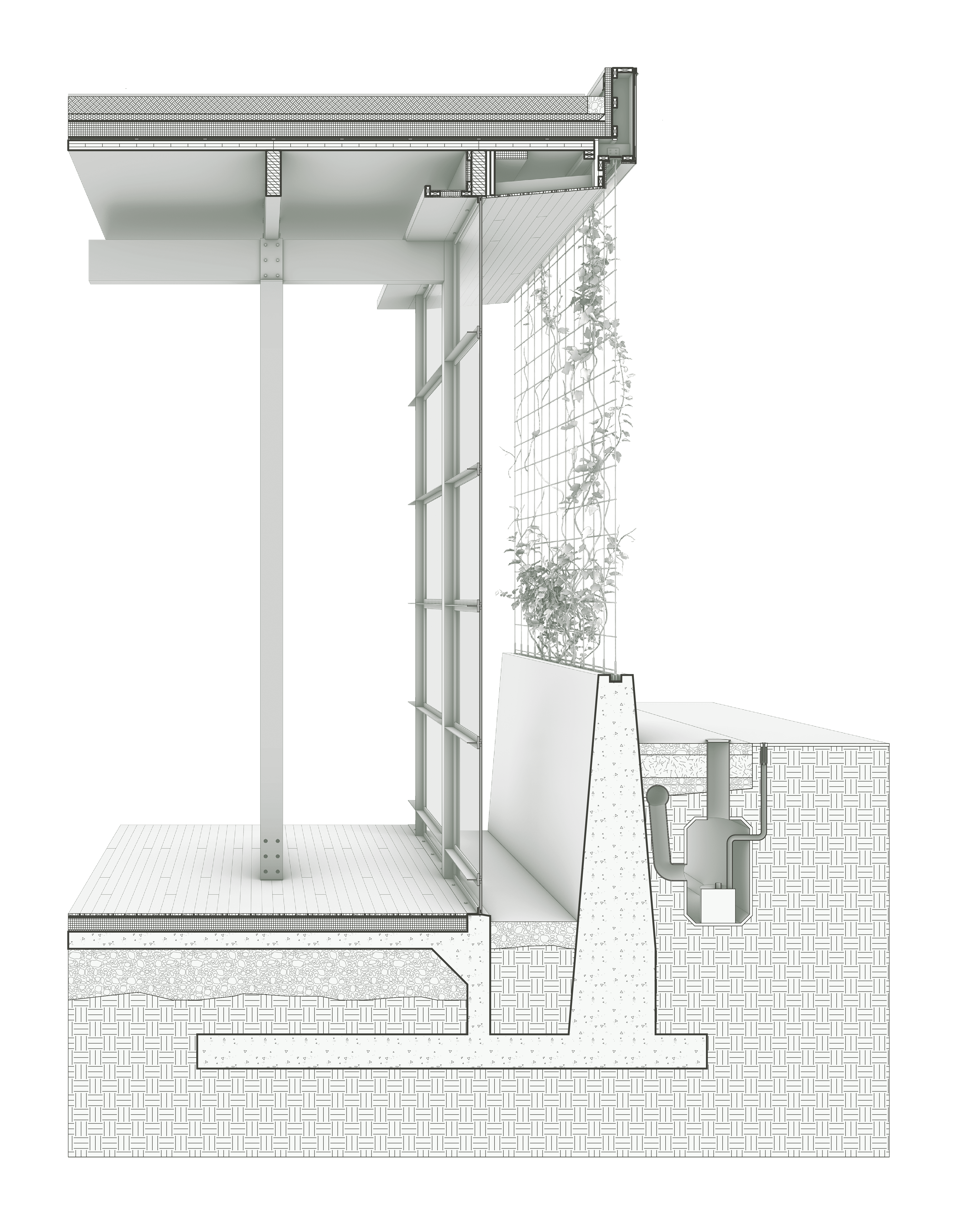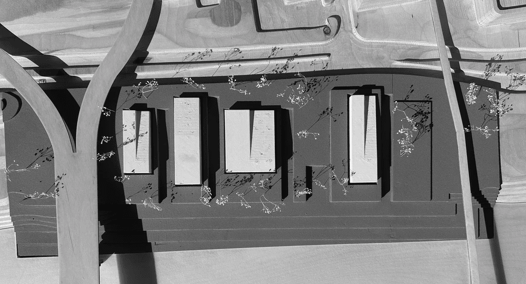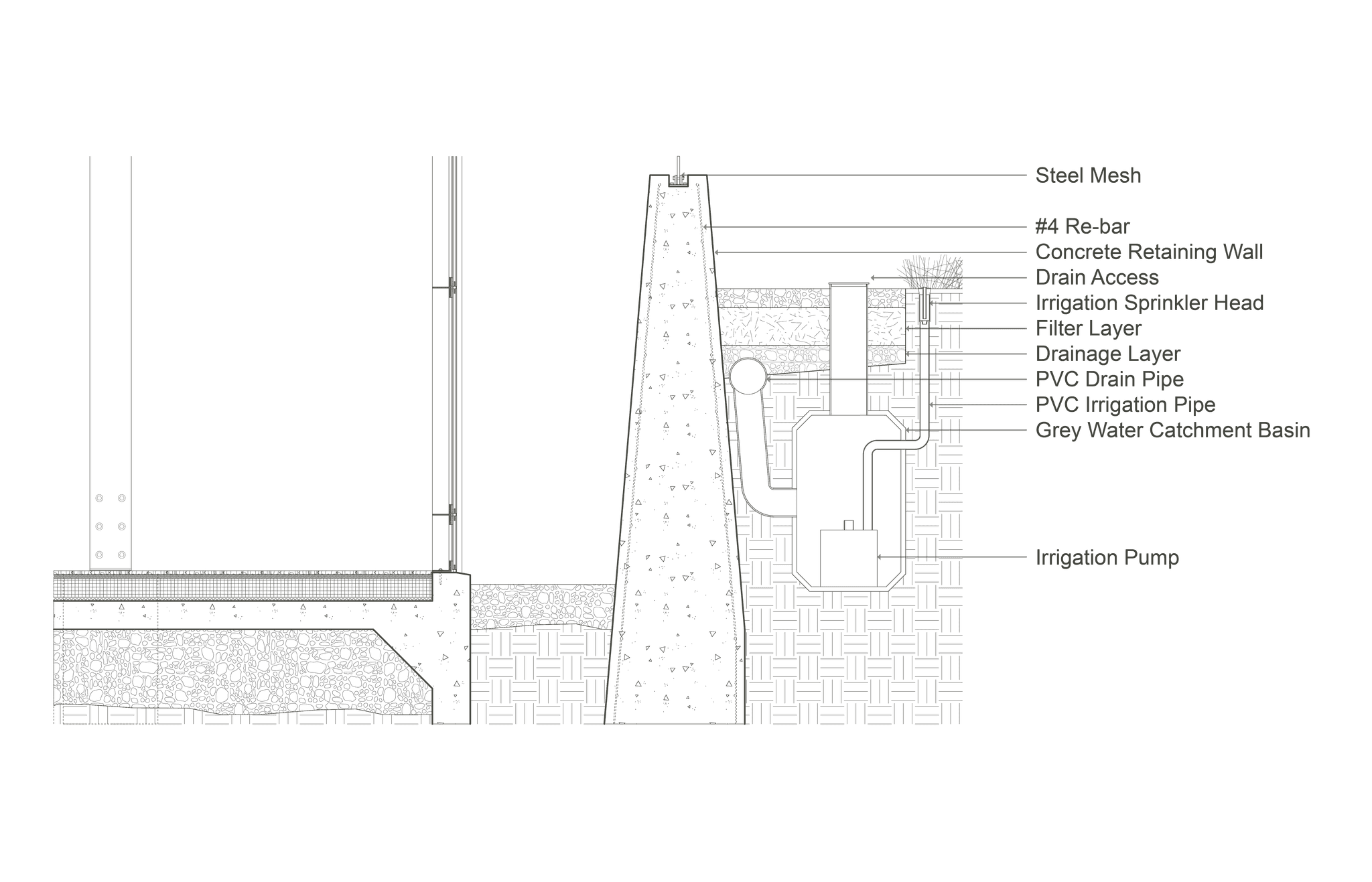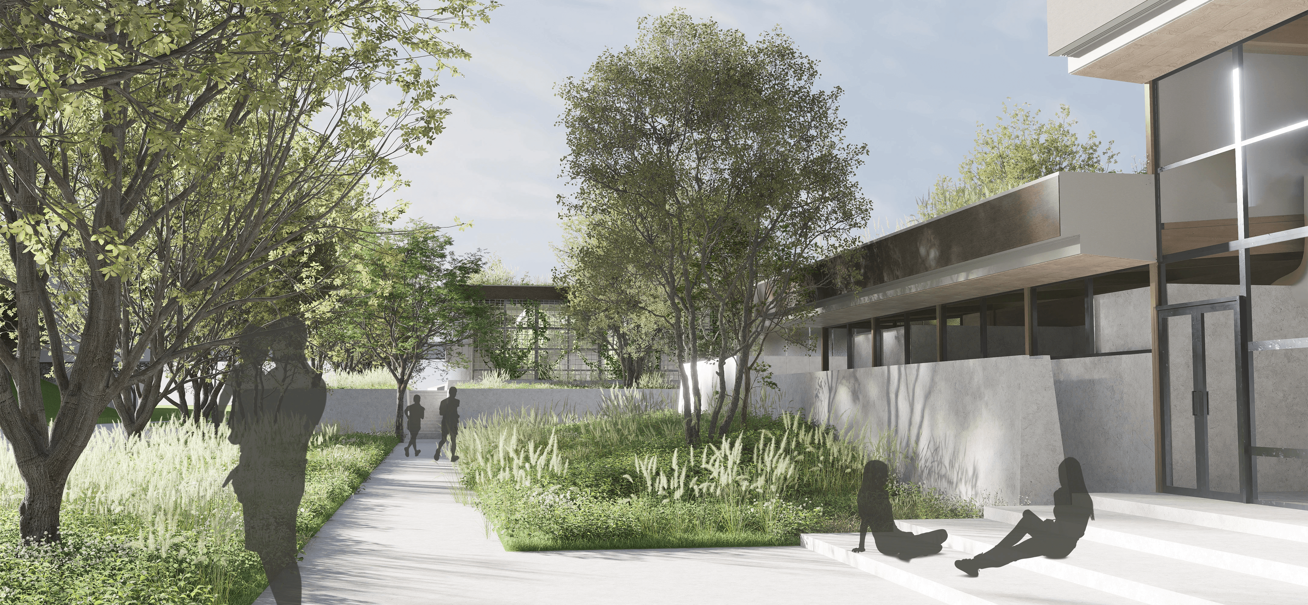 The buildings are designed to actively support sustainable performance through integrated water and landscape systems. Roof and site runoff is collected, slowed, and redistributed through a network of retention and drainage elements that support on-site irrigation and reinforce the site’s ecological cycle. Facades incorporate mesh wire green walls that function simultaneously as solar shading, environmental buffering, and living infrastructure. These planted surfaces soften the architectural edges, filter light, and maintain a continuous presence of greenery throughout the campus.