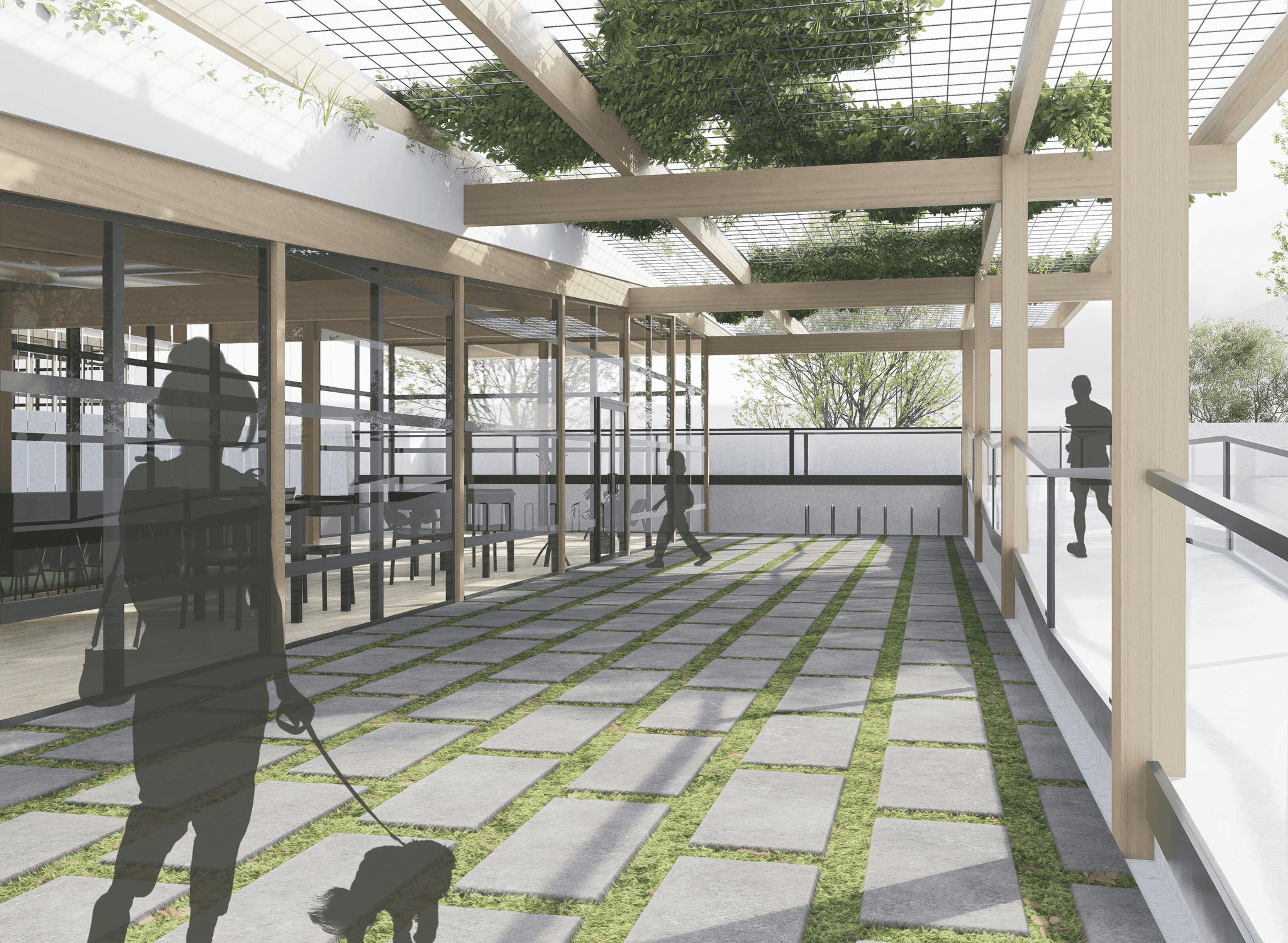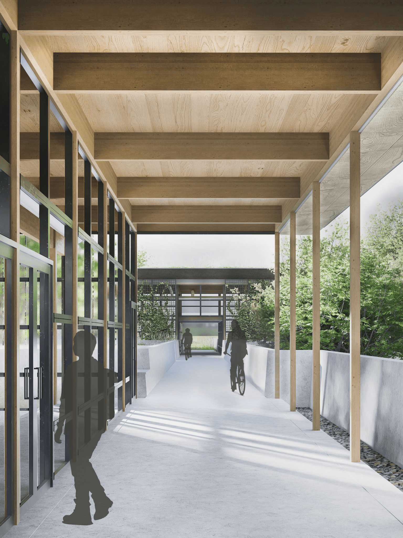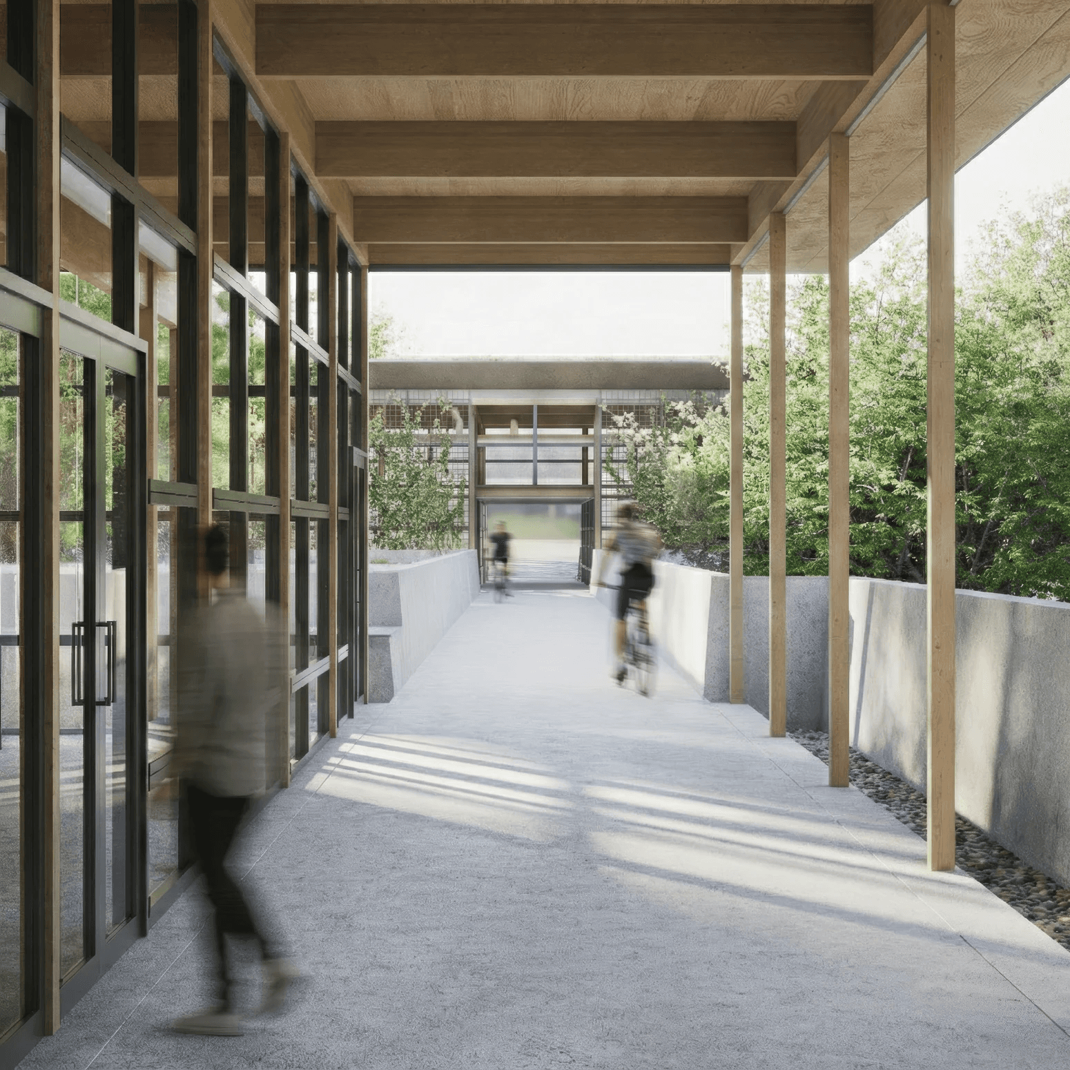 Material and formal decisions reinforce this balance between definition and adaptability. Mass timber, concrete, and steel establish a clear structural and architectural language, while a living screen wall moderates daylight and softens space.